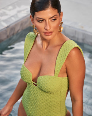 Este body verde pistache em tecido com textura une design e sofisticação em uma única peça. O modelo apresenta um decote estruturado que valoriza o busto, aliado a alças largas que garantem sustentação impecável e um visual geométrico diferente. Sua cor vibrante ilumina a silhueta, tornando-o a escolha perfeita para transitar com elegância entre a praia e composições casuais na cidade.