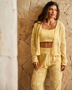 Esta calça é uma peça de destaque, pois une o charme do artesanato com a sofisticação moderna. Confeccionada em um tecido com textura de crochê na vibrante cor amarela, ela traz um visual alegre e elegante. O corte é reto e a cintura alta garante um caimento que alonga a silhueta. Para o seu conforto, a peça possui um short interno como forro. Ideal para compor conjuntos casuais de praia e piscina, oferecendo leveza e muito estilo.