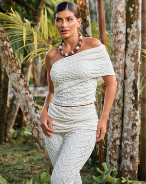 Esta calça em tom off-white destaca-se pelo design sofisticado e pela textura rica em bordados de relevo que percorrem toda a peça. O modelo apresenta uma pala franzida e drapeada na cintura, que valoriza a silhueta de forma elegante, seguida por um corte fluido que garante movimento e leveza. Com um toque artesanal e contemporâneo, é a escolha ideal para compor um conjunto monocromático de resort, unindo o conforto de uma modelagem bem estruturada à sofisticação dos detalhes tridimensionais.
