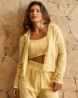 Este casaqueto é a terceira peça perfeita para adicionar um toque de estilo artesanal e elegância ao seu look de verão. Confeccionado em um tecido com textura de crochê na vibrante cor amarela, ele proporciona um visual alegre e arejado. A modelagem é soltinha, com comprimento mais curto e mangas longas, ideal para ser usado como uma sobreposição leve, oferecendo conforto sem aquecer demais. Essencial para criar um conjunto sofisticado e moderno.