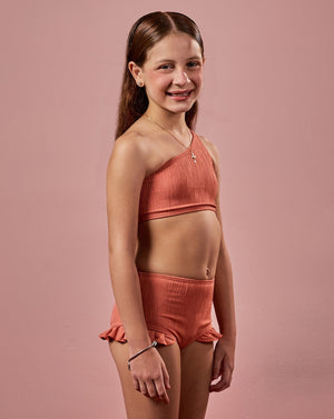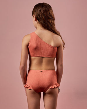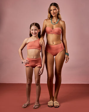 Este conjunto infantil rosa é uma opção encantadora e cheia de estilo para as pequenas. O top apresenta um design moderno de um ombro só, trazendo uma tendência atual para a moda praia infantil. A calcinha, com modelagem de cintura alta, destaca-se pelo delicado detalhe de babados nas pernas, que adiciona um toque lúdico à peça. Esse conjunto garante conforto e liberdade de movimento para brincar à vontade sob o sol.
