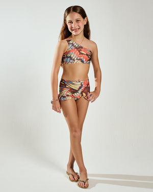 Este biquíni infantil oferece versatilidade e conforto para as crianças. O top assimétrico de um ombro só e a calcinha alta estilo hotpants com detalhes de babados criam um visual moderno e divertido. A peça é prática para uso na praia ou piscina, com secagem rápida e proteção solar.