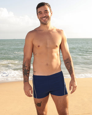 Esta sunga boxer azul marinho combina um visual esportivo com detalhes refinados, apresentando listras brancas verticais que alongam a silhueta. Seu corte com lateral larga oferece cobertura total e máximo conforto, sendo ideal para quem busca segurança e estilo à beira-mar. Confeccionada em material de alta qualidade, a peça garante ajuste perfeito ao corpo e durabilidade para diversas temporadas de sol.