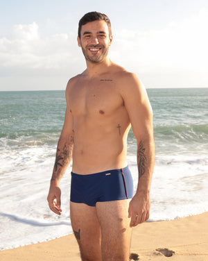 Sunga azul marinho com listra lateral laranja
