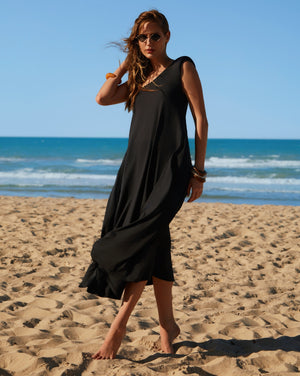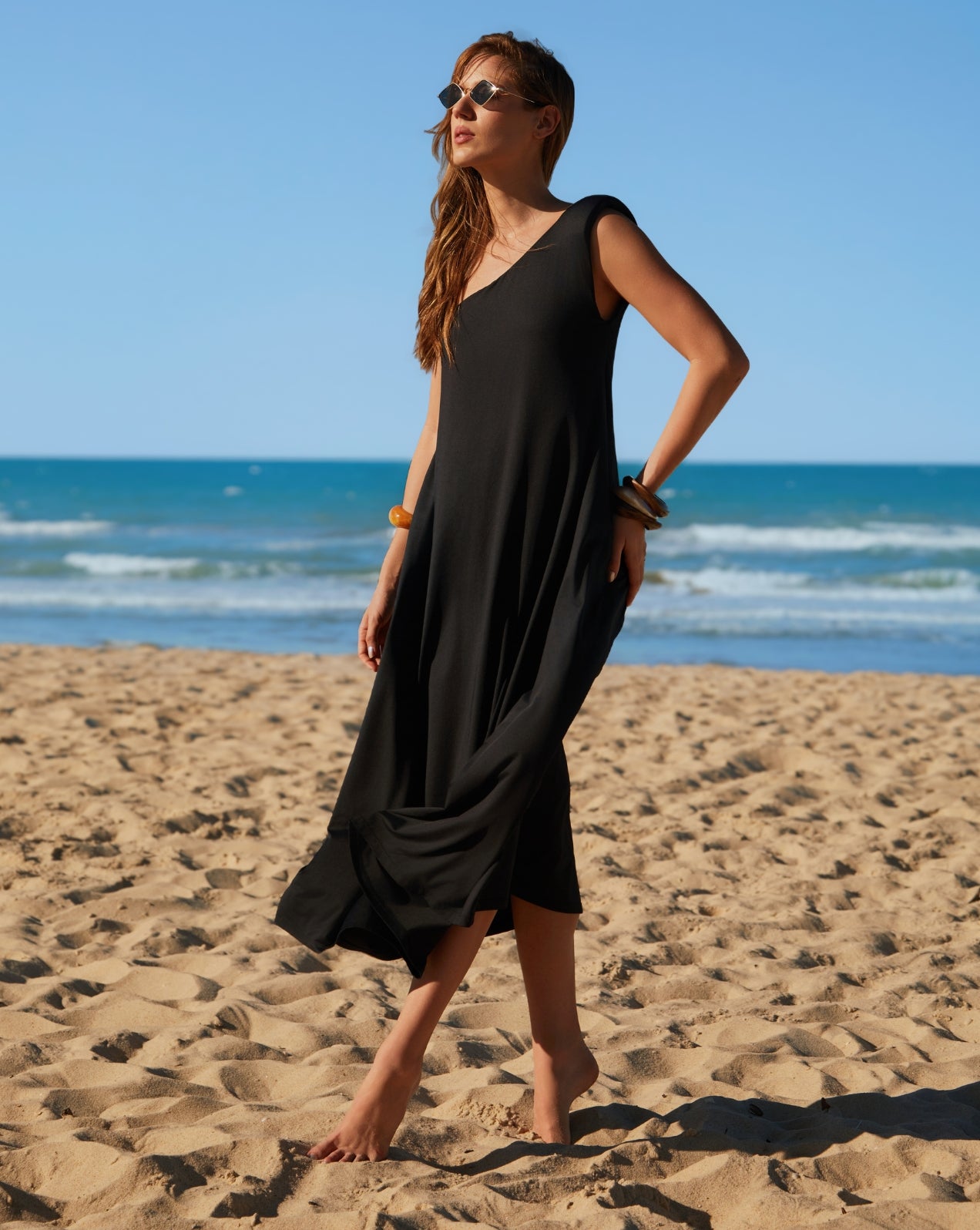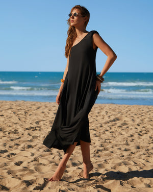 O vestido midi assimétrico une sofisticação minimalista e modernidade através do design de um ombro só com ombreira estruturada. Sua modelagem fluida garante elegância sem esforço, transitando perfeitamente de eventos solares para ocasiões urbanas refinadas.